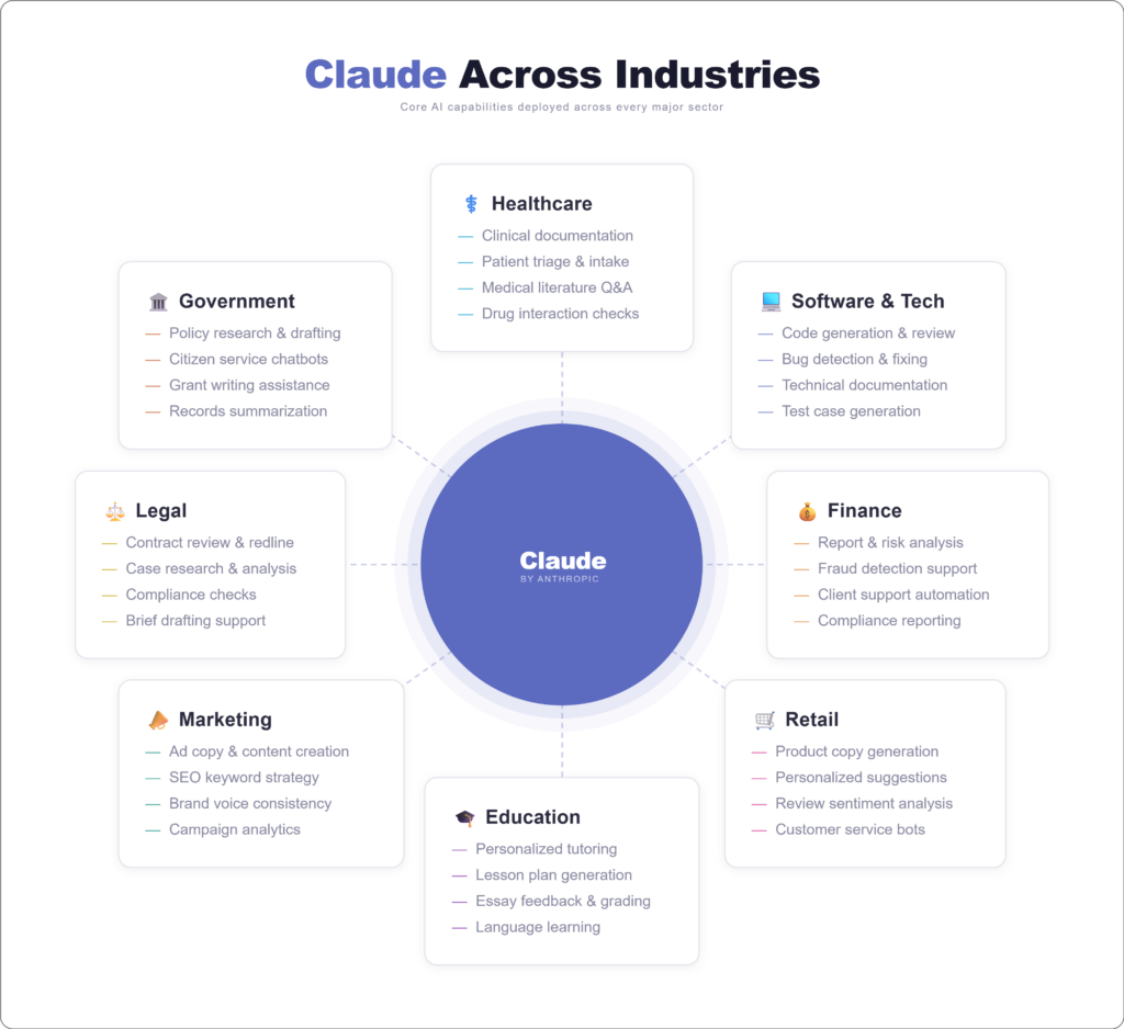 This focus on trust and quality is why Claude is increasingly used in fields like law, healthcare, finance, research, and software development.