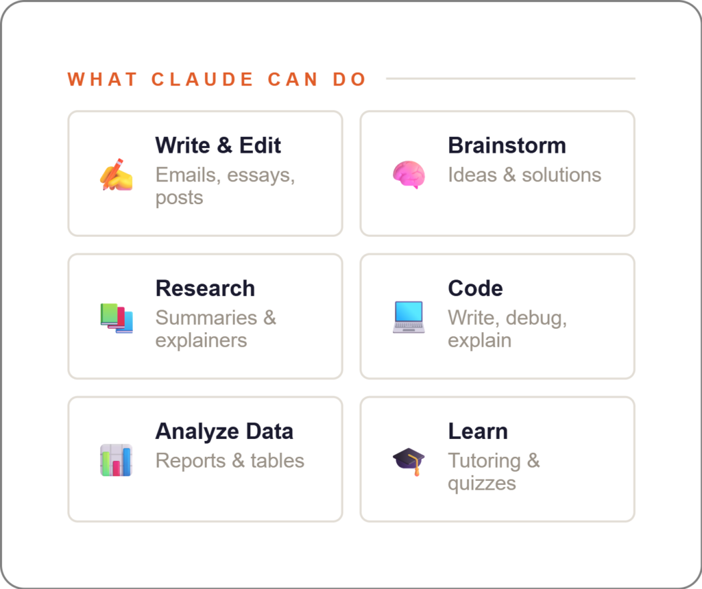 Claude’s main product is its chat-based assistant, available to anyone with an internet connection. You can ask questions, upload documents, request summaries, write or edit content, brainstorm ideas, or ask for explanations and Claude responds with thoughtful, well-structured answers.