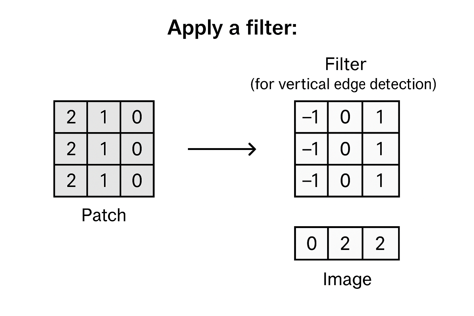 1. Apply a filter: A filter (also called a kernel) is placed on this patch. Suppose the filter is designed to detect vertical edges. The filter slides over the patch, multiplies the numbers, and highlights areas where vertical lines are present. Example: Filter (for vertical edge detection)