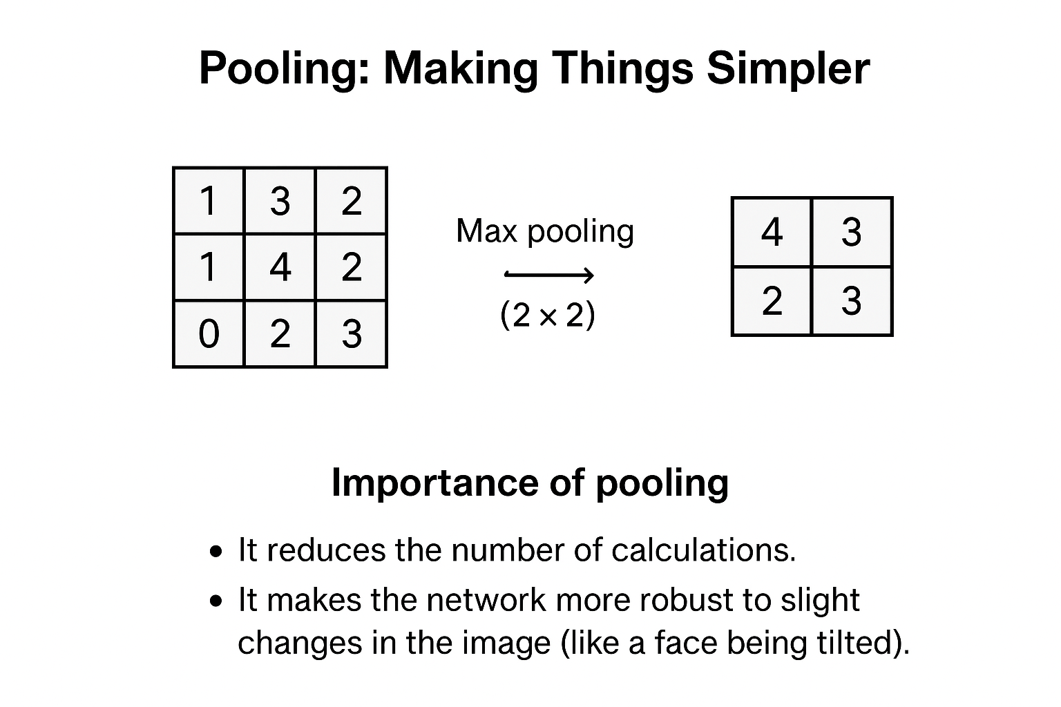 Once filters have extracted features, CNNs use another clever trick called pooling. Pooling reduces the size of the image while keeping important information intact.
