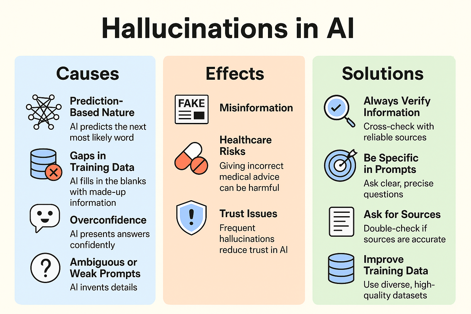 The good news? With careful design, constant updates, fact-checking, and responsible use, hallucinations can be reduced. The key is not to blindly trust AI but to treat it as a powerful assistant that still needs human judgment.