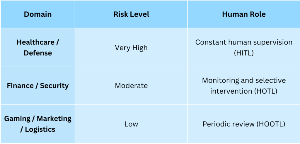Not every system needs the same degree of human supervision. The right level depends on the domain, risk, and consequence of errors.