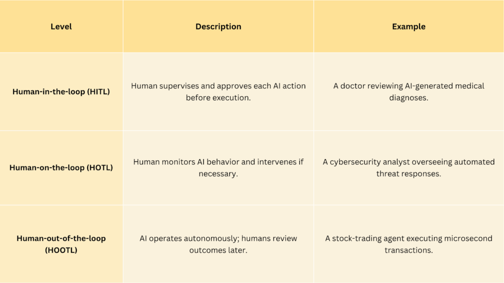 These levels define how autonomy and oversight balance in different use cases — the higher the risk, the tighter the human control.
