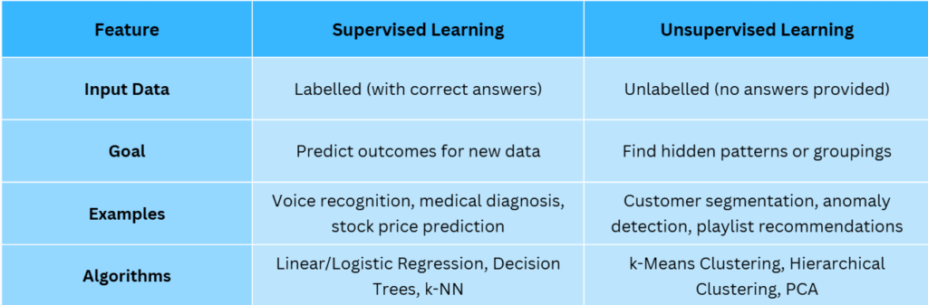 In this article, we will focus on supervised vs unsupervised learning, explaining how each works, the algorithms behind them, and practical examples where they are applied in the real world.