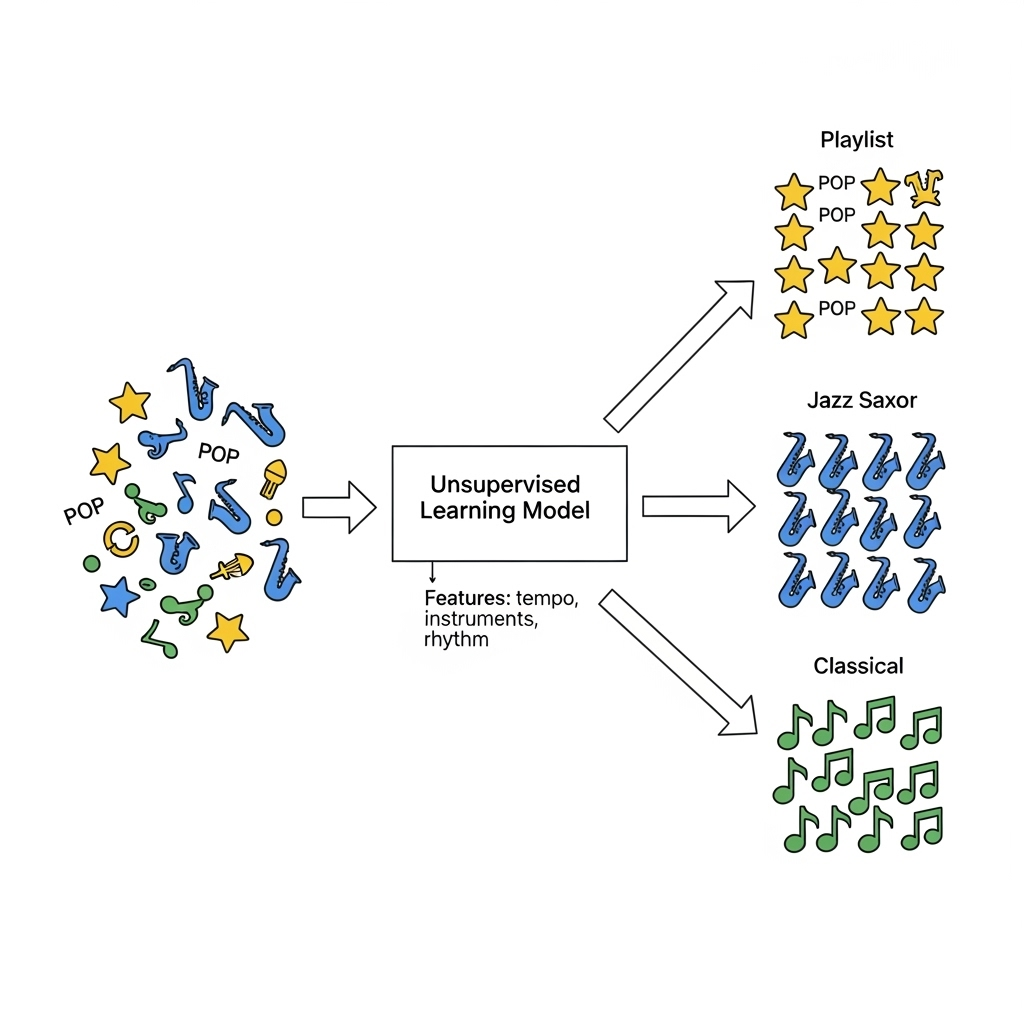 Consider a music streaming service. You listen to various songs, but you never tell the system which ones belong to “pop,” “jazz,” or “classical.” Still, the computer can analyse the features of each song (tempo, instruments, rhythm) and group them into clusters. Later, it recommends playlists based on your listening patterns.
