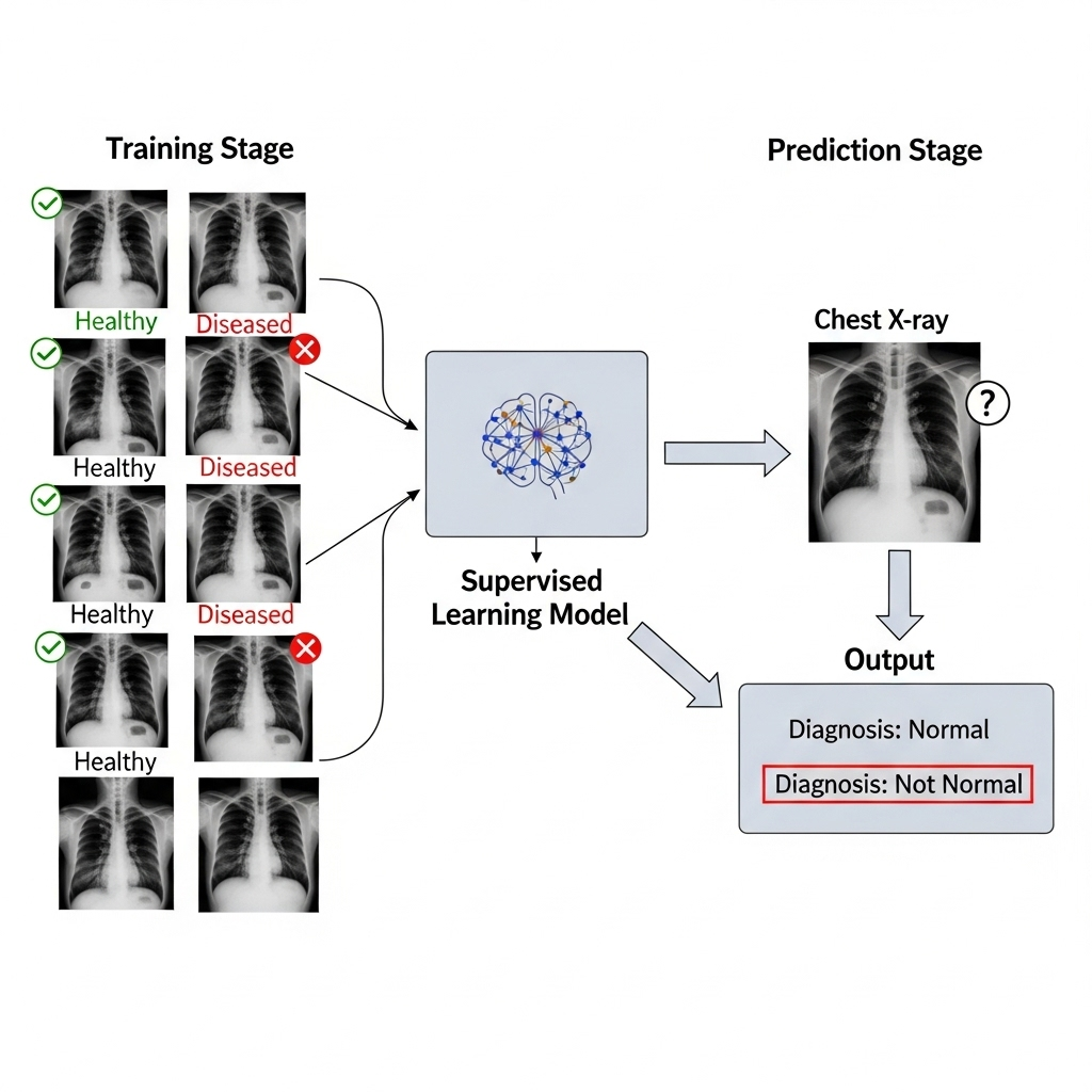 Another example is in medical diagnosis. If doctors provide a dataset of X-ray images marked as “healthy” or “diseased,” the computer will learn to identify which patterns are associated with illness. When a new X-ray is shown, the system can suggest whether it is normal or not.
