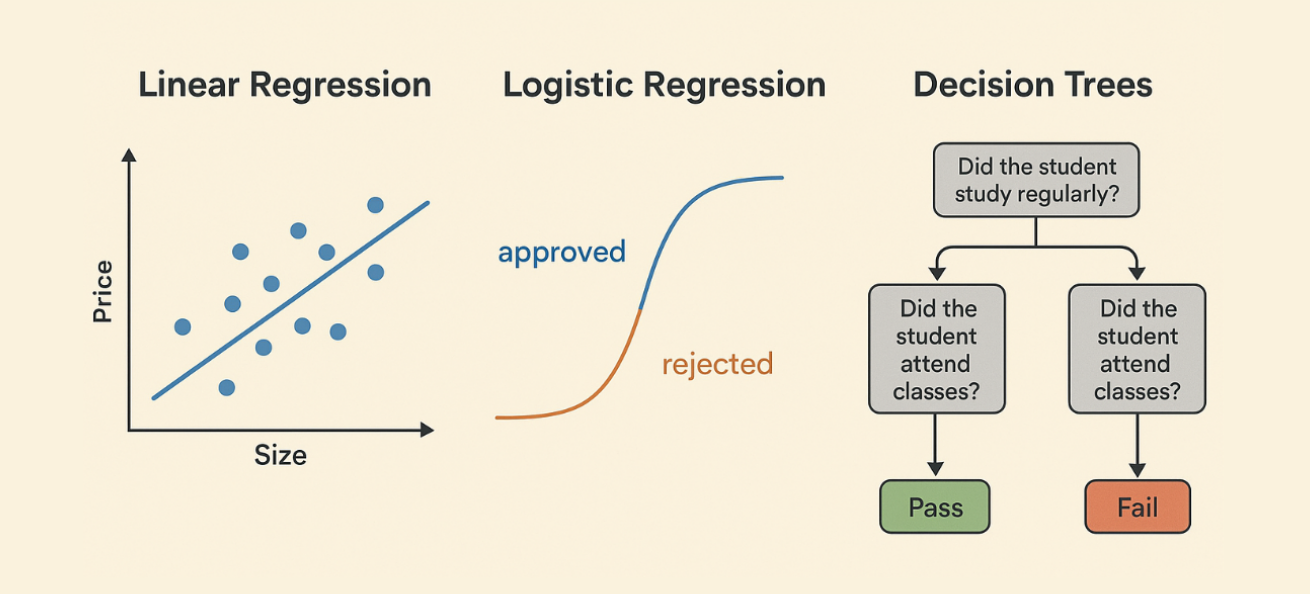 - Decision Trees: A Decision Tree works like a flowchart, splitting data into smaller groups at each question until it reaches a decision. Each branch shows a choice, and the end gives the result.