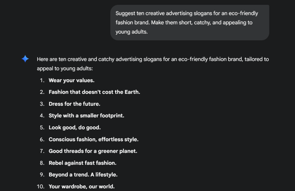 The idea is to keep prompts open enough to invite variety but structured enough to stay on topic. For example, the prompt: “Suggest ten creative advertising slogans for an eco-friendly fashion brand. Make them short, catchy, and appealing to young adults.” produces not just one answer, but a range of options you can refine and adapt.