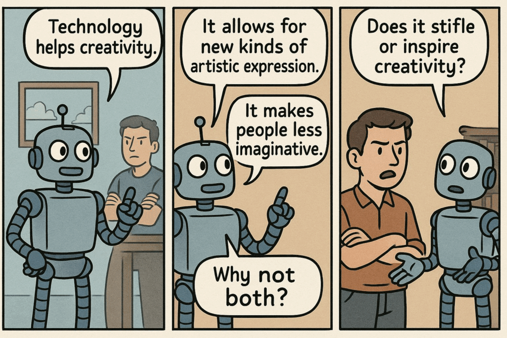 The way this works is by asking artificial intelligence to handle more than one layer of creativity in a single prompt. For example, “Create a comic strip with three panels. Show a robot and a human debating whether technology helps or harms creativity. Provide dialogue for each character and describe the background for each panel.” This prompt gives clear instructions on both text (dialogue) and visuals (panel descriptions), leading to a richer output.